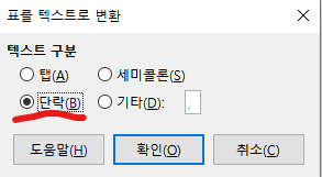 커서를 먼저 박스안에 위치 시켜야 표를 텍스트로 버튼이 활성화 된다. - 대화 상자가 띄워지는데 여기서는 단락을 선택한다.