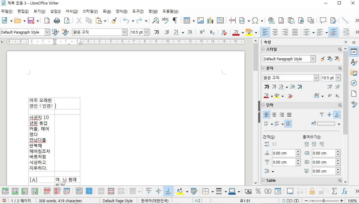 글이 커져서 보이는 부분을 넘겨도 무시하고 진행 한다. - (이번 단계는 넘겨도 되지만 시각적이거나 중간에 발생할 수 있는 버그를 최소화하기 위해 진행할 것을 권장한다.) 커서를 표 안에 위치 시키고 상단의 표 > 변환 > 표를 텍스트로 를 이용하여 표를 없앤다.