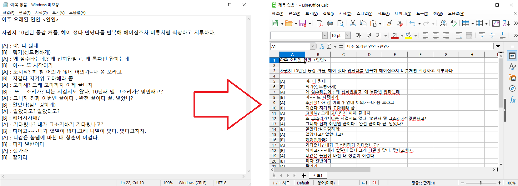 이때 Calc 같은 스프레드 시트로 옮겨서 셀 행을 2개로 바꾸기 위해서는 특별한 구분자를 넣어야 한다. 구분자는 다양한 것을 사용하면 되지만, 내 경우는 탭(tap)이나 콜론(:) 또는 세미콜론(;)을 사용하였다. 이 중 탭은 특정 상황에서 눈에 안보이는 경우가 있어 콜론이나 세미콜론을 사용한다. 예를들어..