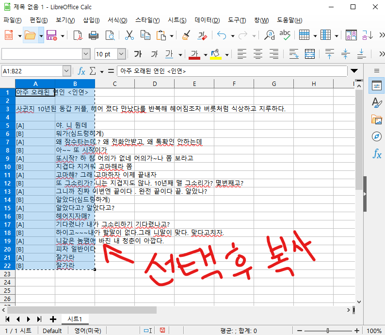 - 앞서 종료하지 않은 Calc 를 띄우고 텍스트가 담긴 셀 채로 복사한다.