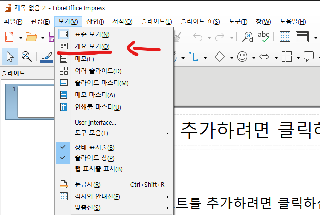 Impress 를 실행시킨다.보기 > 개요 보기를 선택하여 보기를 바꾼다.