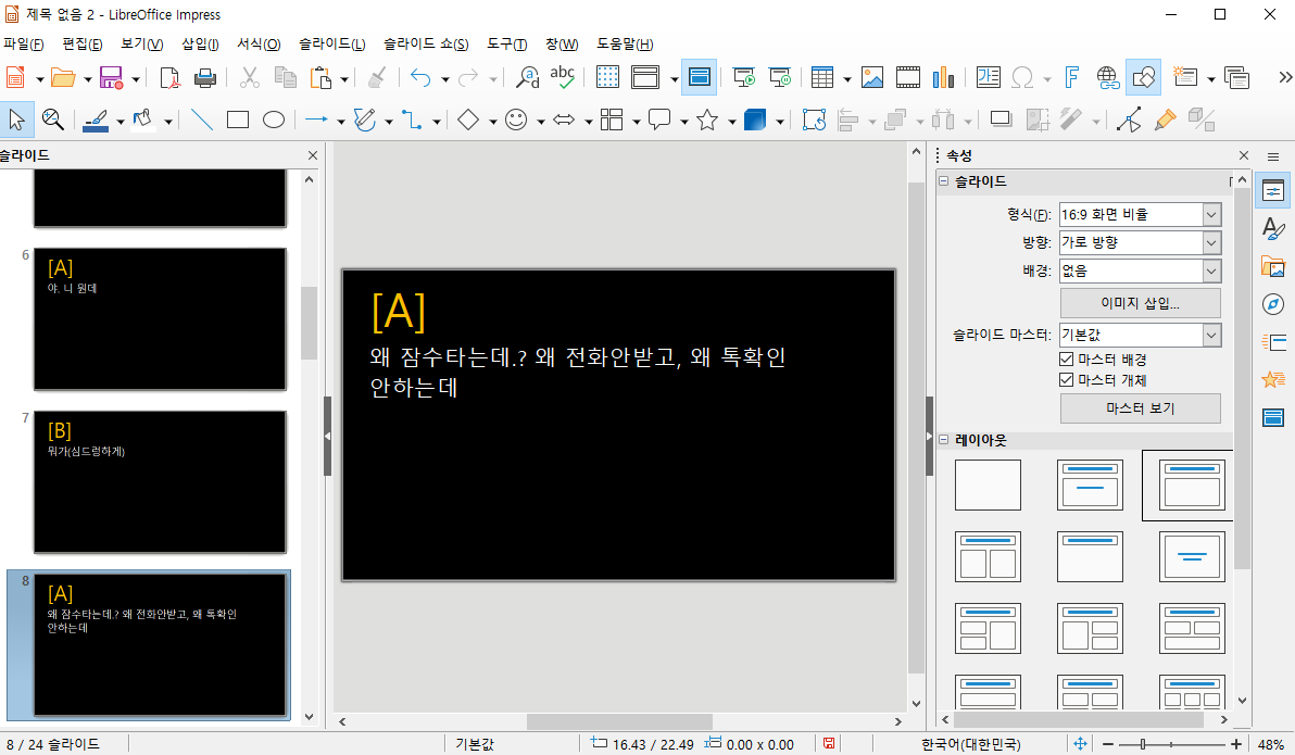 모든 준비가 완료 되었다. 슬라이드 마스터를 이용하여 슬라이드 색이나 화자, 대사 텍스트의 크기를 한 번에 바꿀 수 있다.