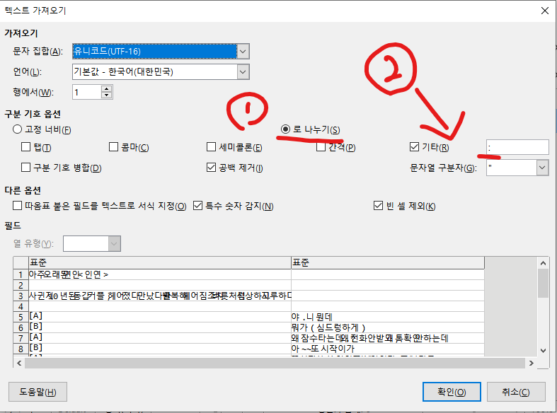 이렇게 옮길때 대화상자가 생긴다. 다이얼 박스에서 ..로 나누기 와 기타를 체크하고 구분자로 넣은 콜론(:)을 사용하도록 하면 2개의 셀로 분할 되어 옮겨진다.
