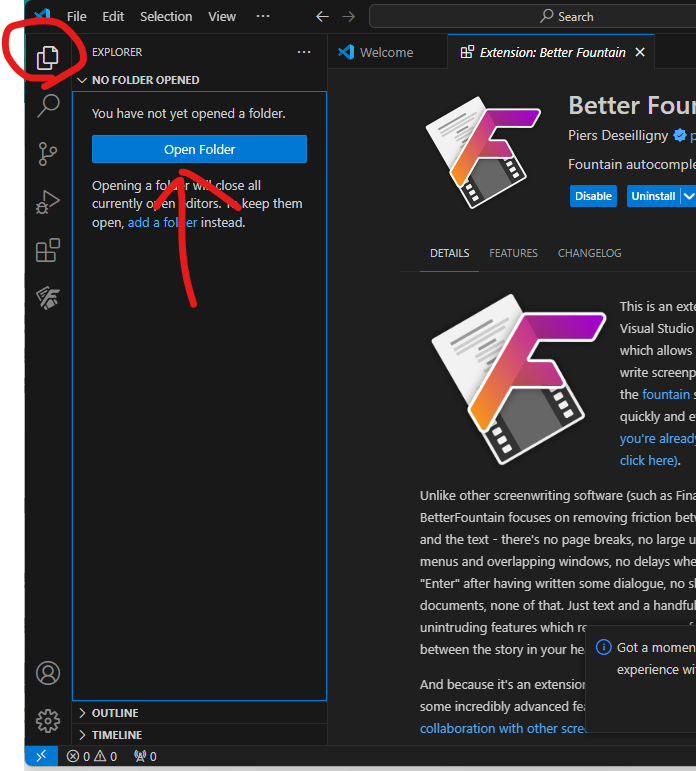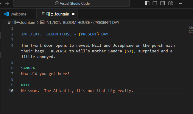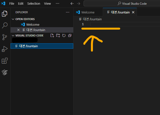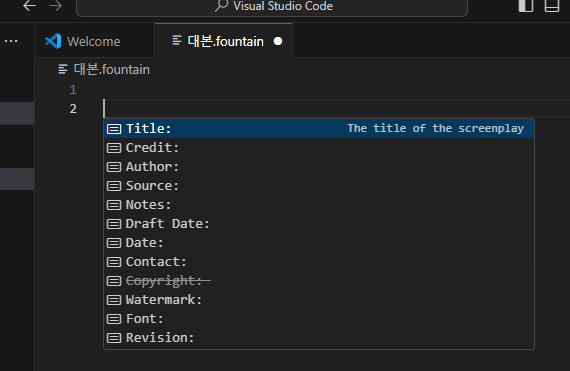 - 비주얼 스튜디오 코드용 fountain 확장기능을 설치한다.