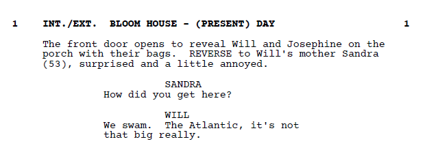 The front door opens to reveal Will and Josephine on the porch with their bags. REVERSE to Will's mother Sandra (53), surprised and a little annoyed.