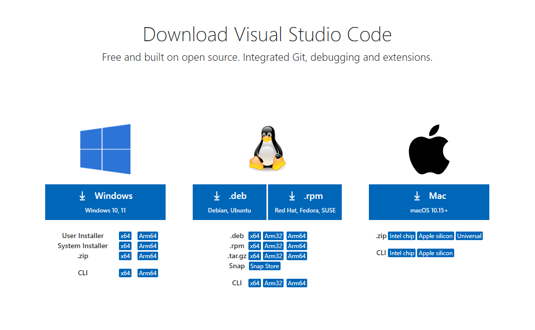 저기 보이는 다운로드 버튼을 눌러 비주얼 스튜디오 코드 다운로드 페이지에 들어가서 자신의 컴퓨터에 맞는 설치 파일을 다운로드 받는다.