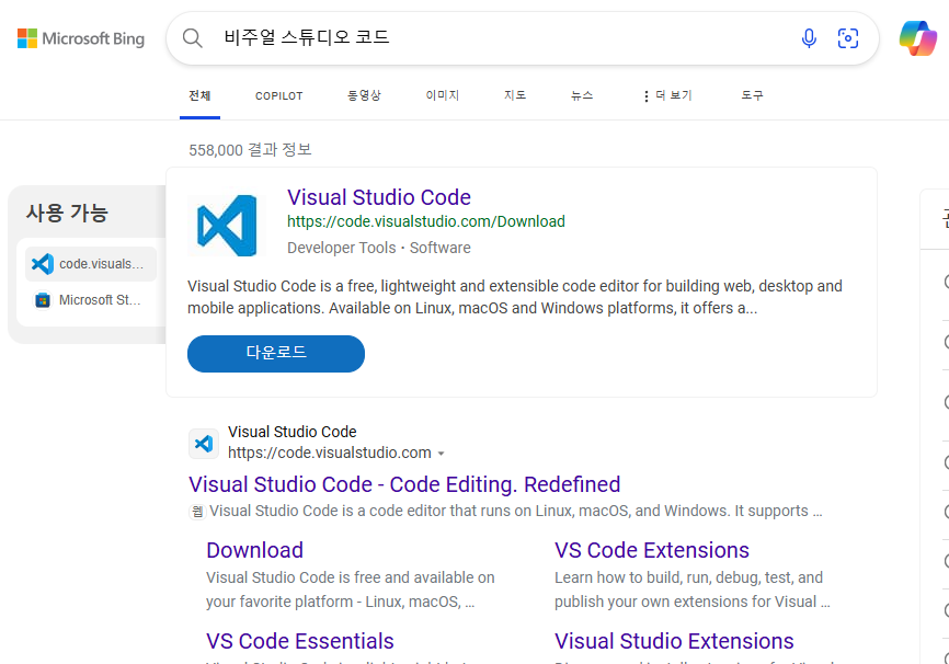 검색창에 "비주얼 스튜디오 코드" 라고 입력하면 다운로드가 보여진다.