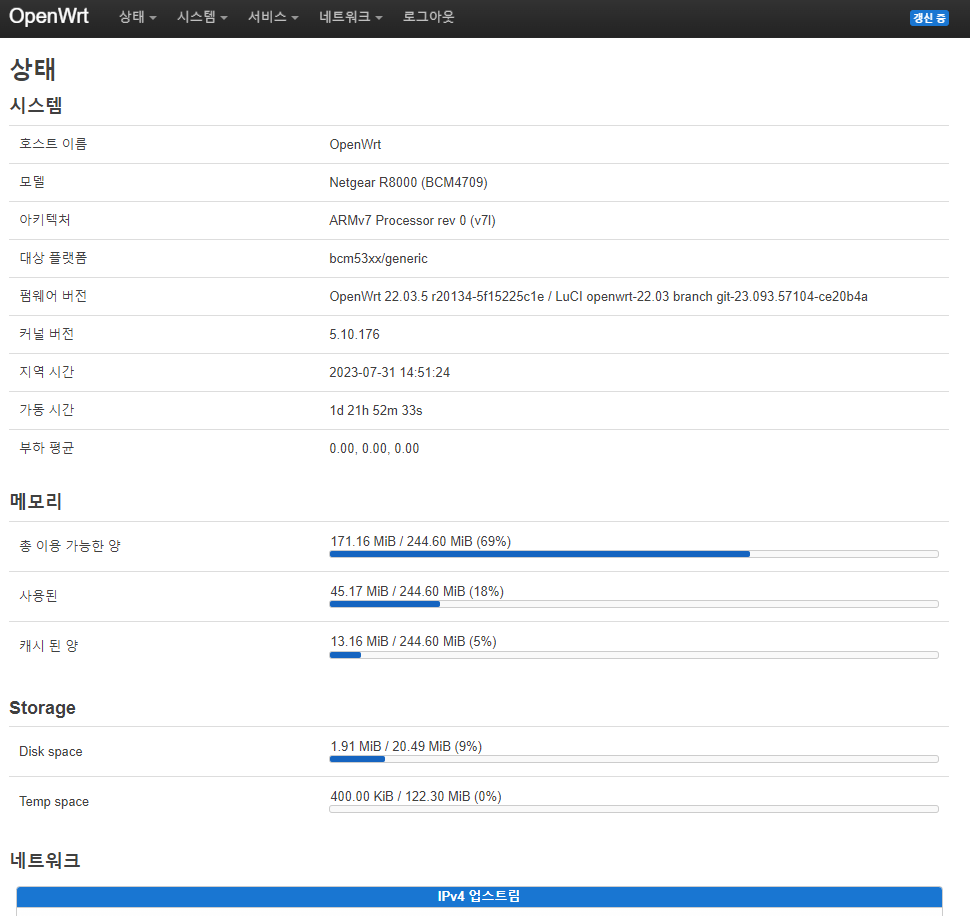 NETGEAR r8000에 dd-WRT를 올려서 몇 개월 사용하다가 2G가 안되는 결점도 있고 Save & Apply 를 누르면 페이지가 깨져서 설정이 제대로 적용 안되는 불안정한 문제가 있어서 - dd-WRT는 웹페이지로 asp를 쓰는데 희안하게 내가 겪는 장애는 asp에서 오는 경우가 제법 있다.- 다른 펌으로 갈 생각을 여러번 하다가 이번에 openWRT를 올려보았는데 이런 신세계가 따로 없다.