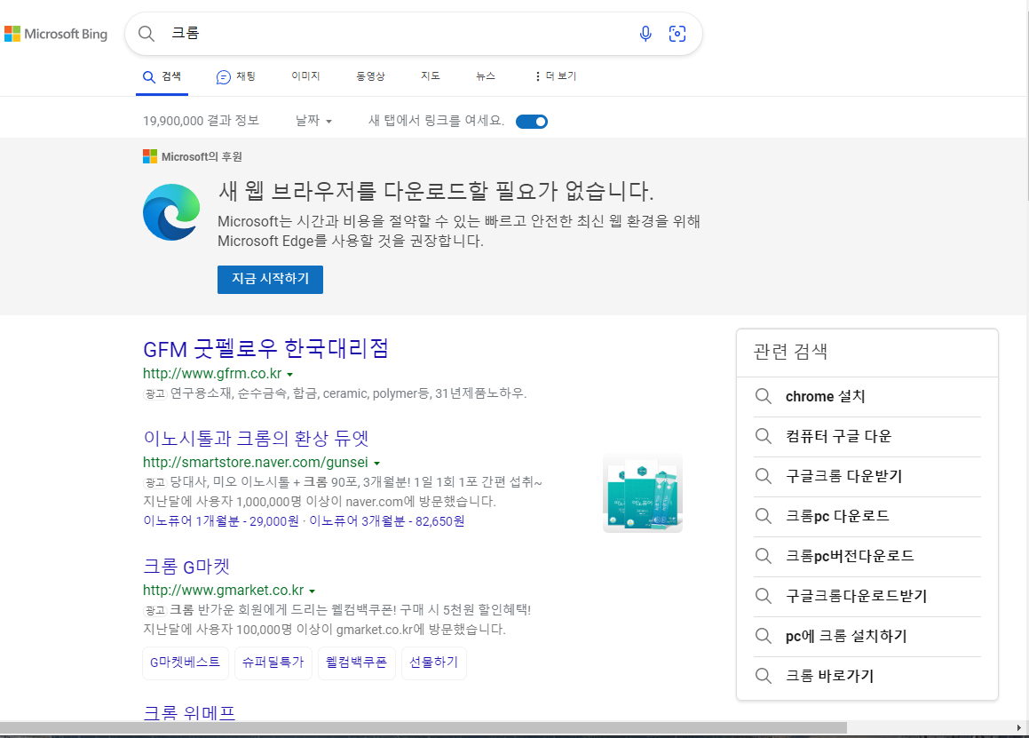 1차 검색 결과 - 상단에 Edge 권장 링크가 있다. 아래 검색 결과는 크롬과 관련이 1도 없다.