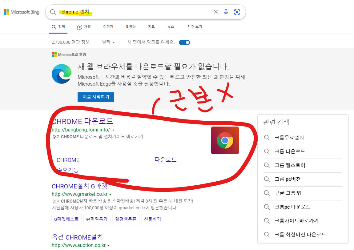1차 검색 결과 - 상단에 Edge 권장 링크가 있다. 아래 검색 결과는 크롬과 관련이 1도 없다.