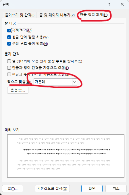 텍스트 맞춤을 "자동"에서 "가운데"로 바꾸면