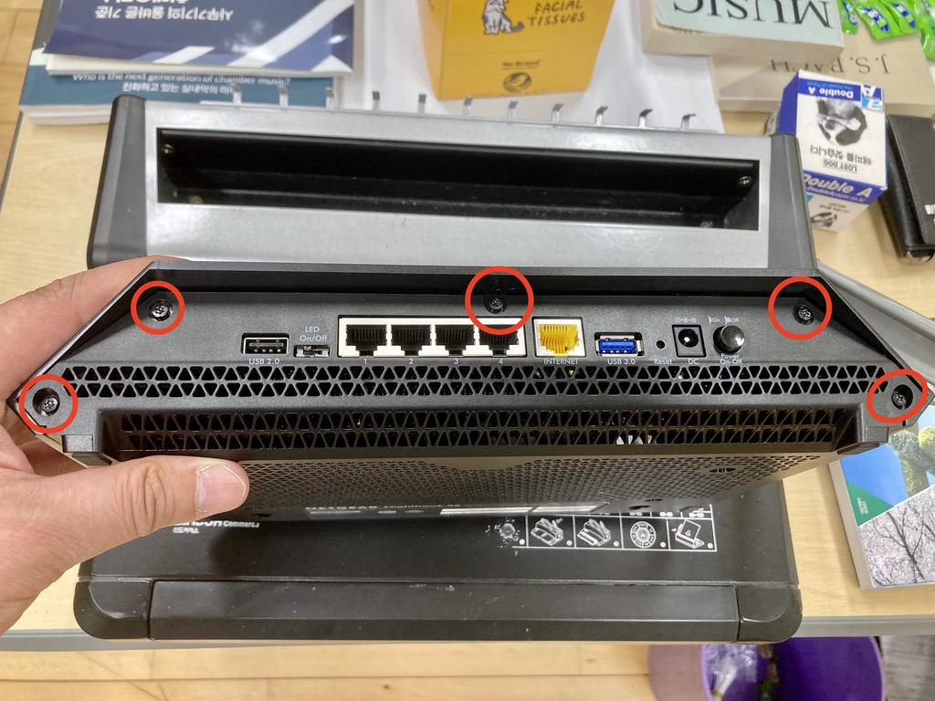 이 공유기는 특이하게 별 나사를 사용한다. 일자 십자 드라이버만 있는 평범한 집(?)이라서 난감했다.