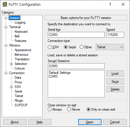 이상 시리얼 포트에 케이블 연결이 끝나면 putty 로 접속을 시도 해본다.