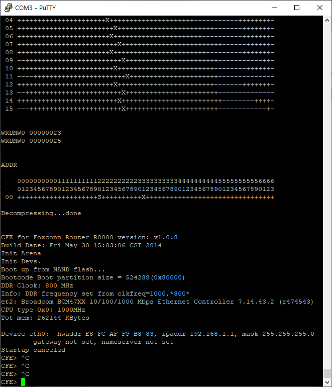 처음 Open을 클릭해서 연결을 시도하면 터미널에는 반응이 없다. 이후 공유기를 켜서 부팅시키면 터미널에 부팅 내용이 출력되게 된다. 그리고 터미널에서 무한 재부팅되는 공유기 상태를 볼 수 있는데, 이 때 Ctrl + c 를 누르면 CFE 프롬프트로 빠진다. 즉, 명령어를 입력할 수 있는 상태가 된다.